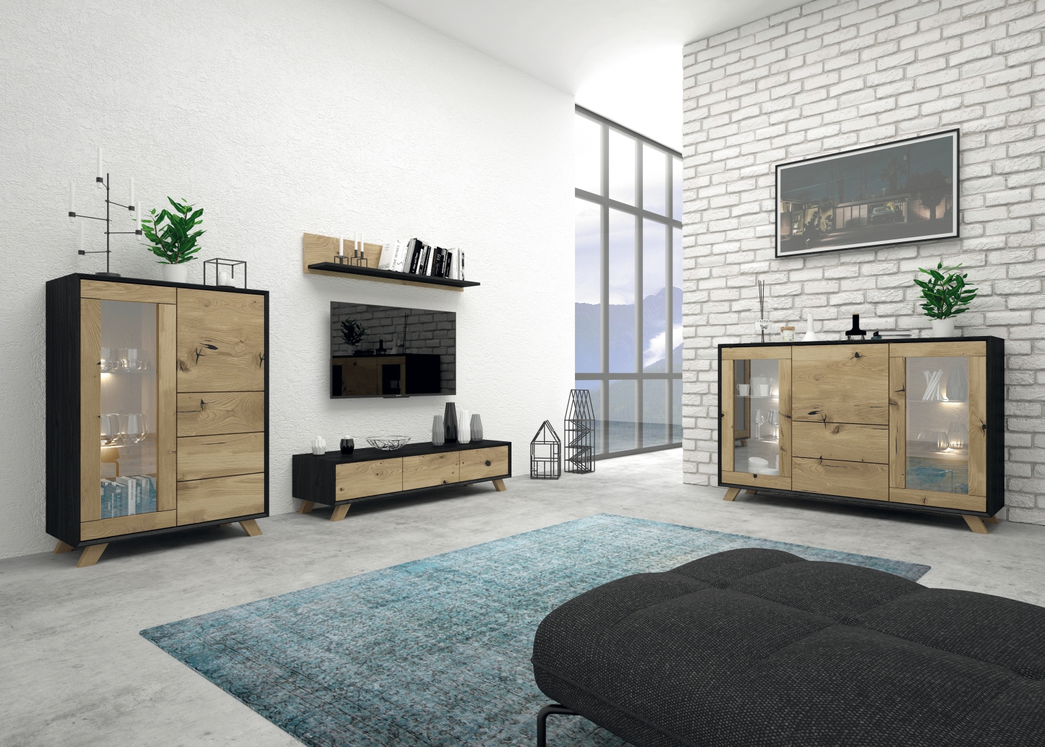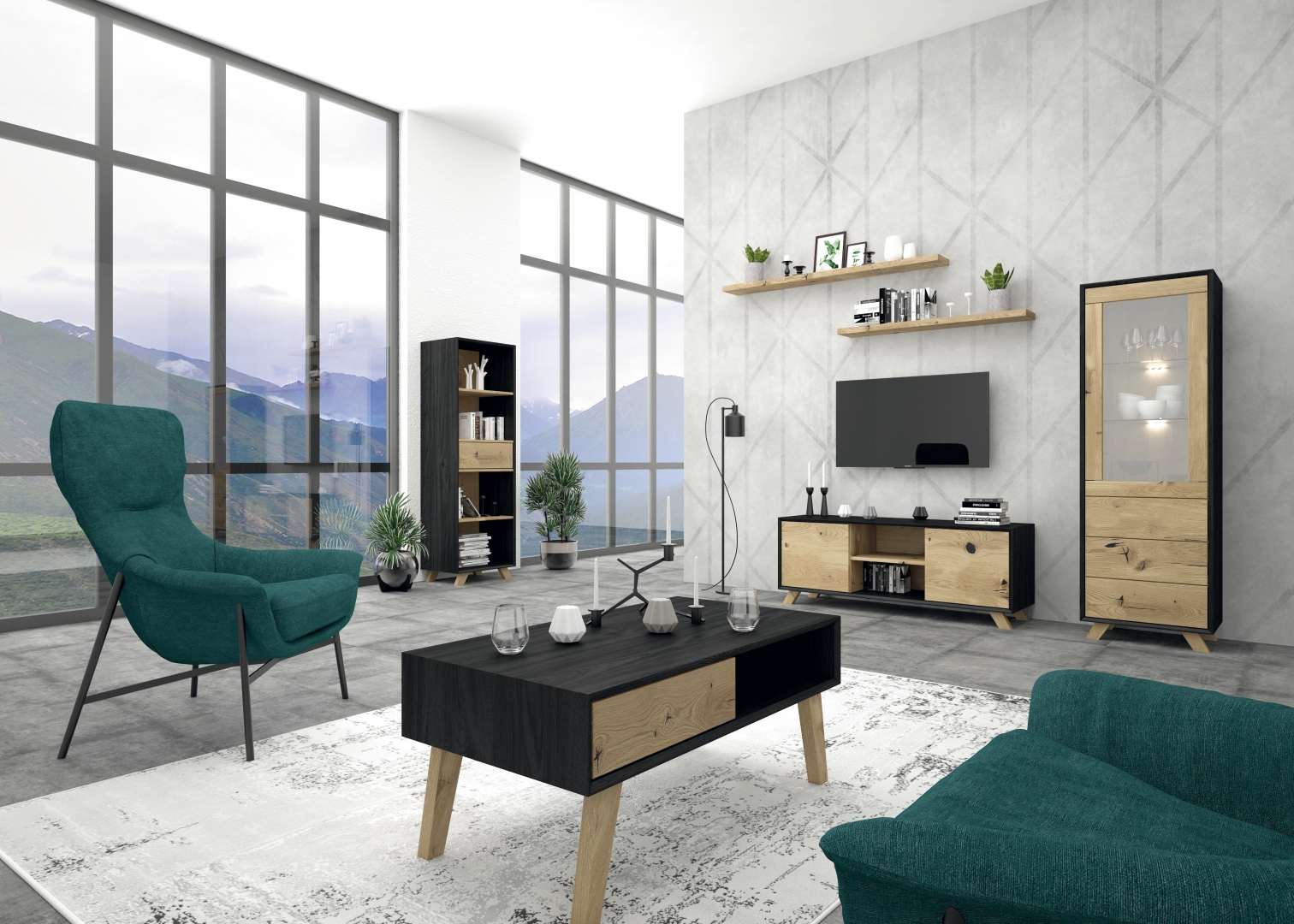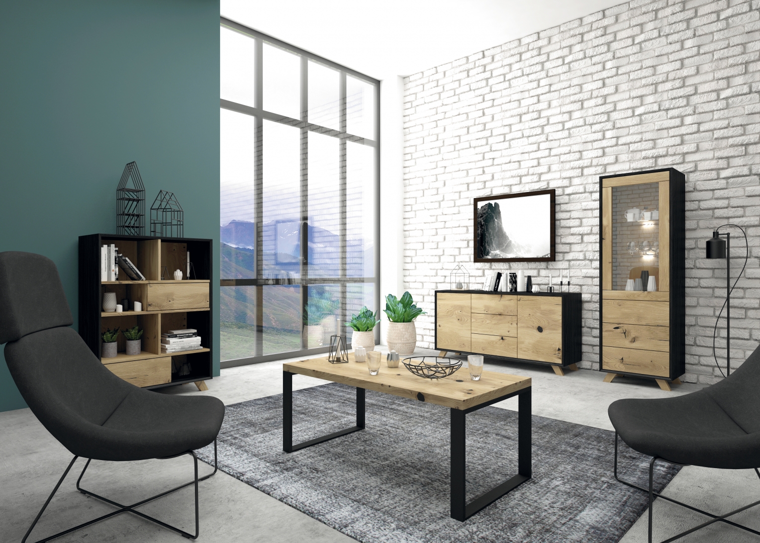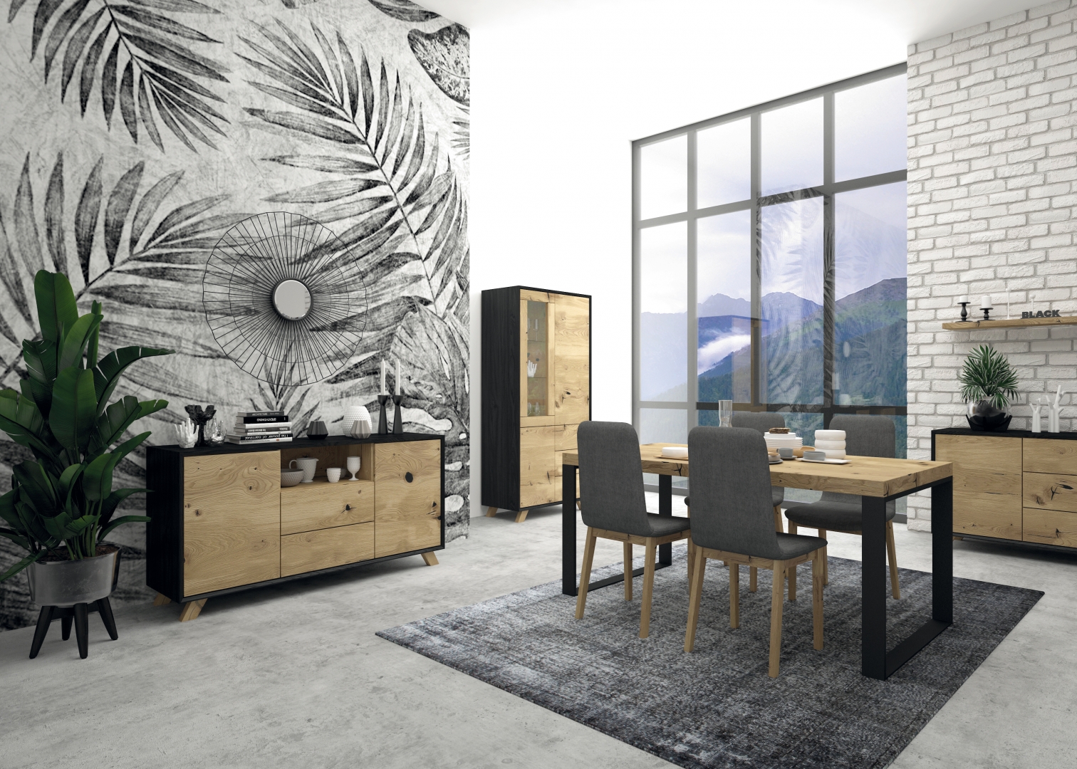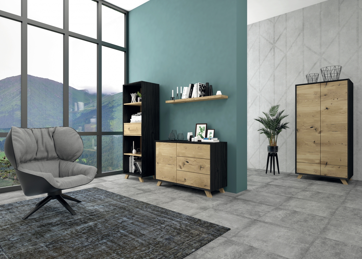 Meble w stylu skandynawskim. Czarny matowy korpus oraz drzwi frontowe z czarnymi sękami, pęknięciami, przerostami i przebarwieniami sprawiają, że każdy element kolekcji jest wyjątkowy i niepowtarzalny. Metalowe czarne nogi przy ławach i stołach świetnie komponują się z jasną barwą drewna. Dzięki delikatnym, smukłym i drewnianym nóżkom przy bryłach oraz niepowtarzalnym wzorom całość nabiera oryginalnego charakteru. Meble z przeznaczeniem do pokoju dziennego, jadalni i sypialni.