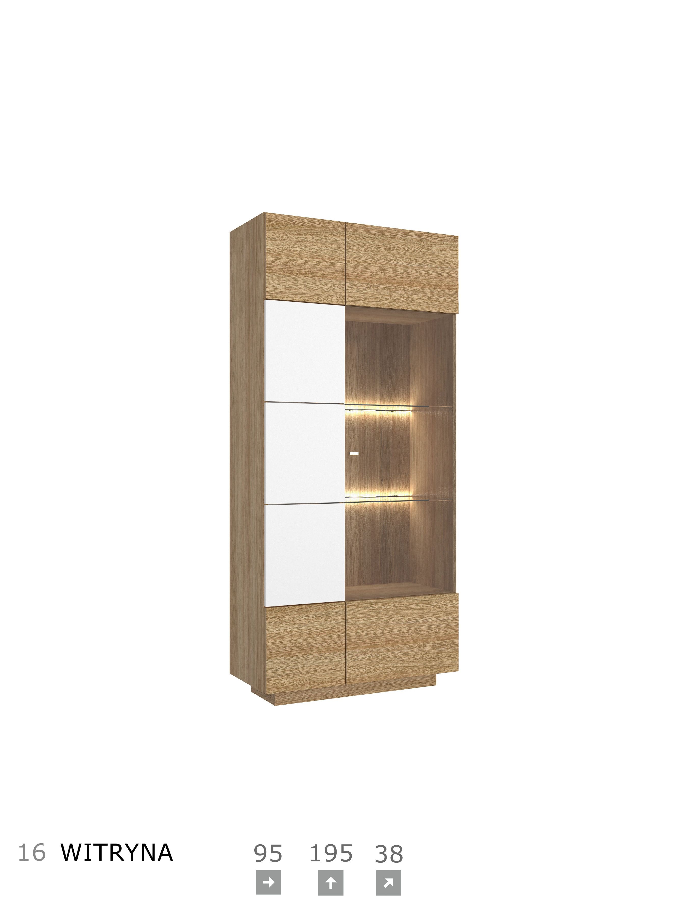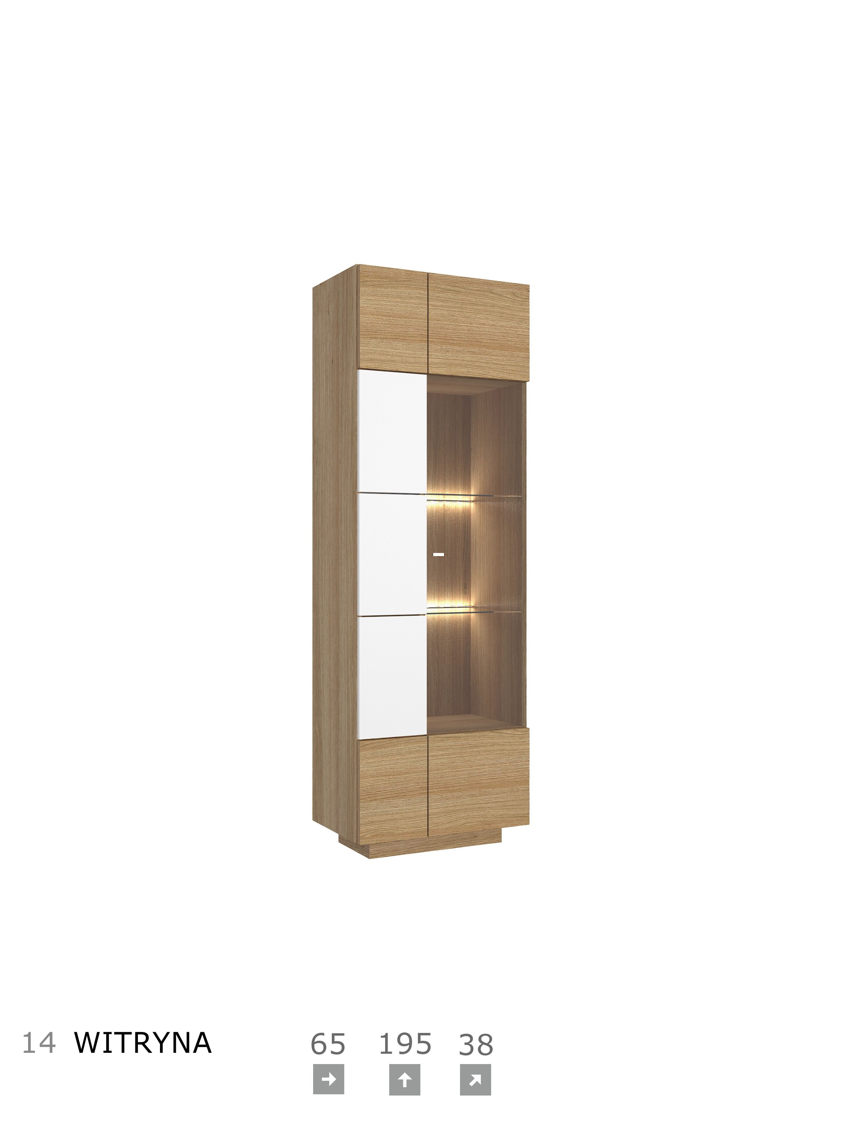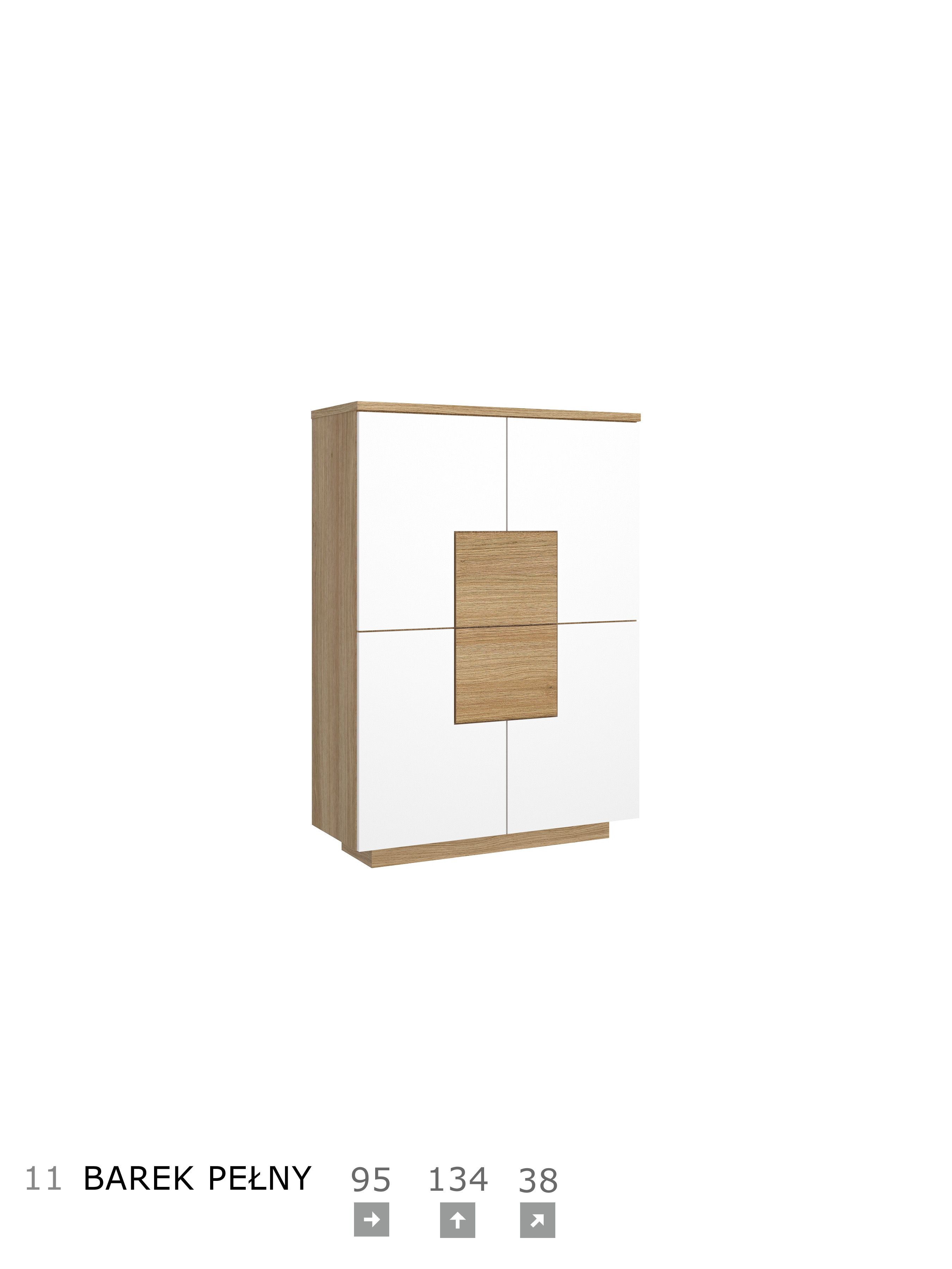 Korpus i blat: okleina naturalna dębowa, płyta meblowa Fronty: okleina naturalna dębowa, płyta meblowa, MDF Szkło: front antisol, półka float System otwierania: push to open, bez uchwytu Witryna i barek: cichodomyk, uchwyt