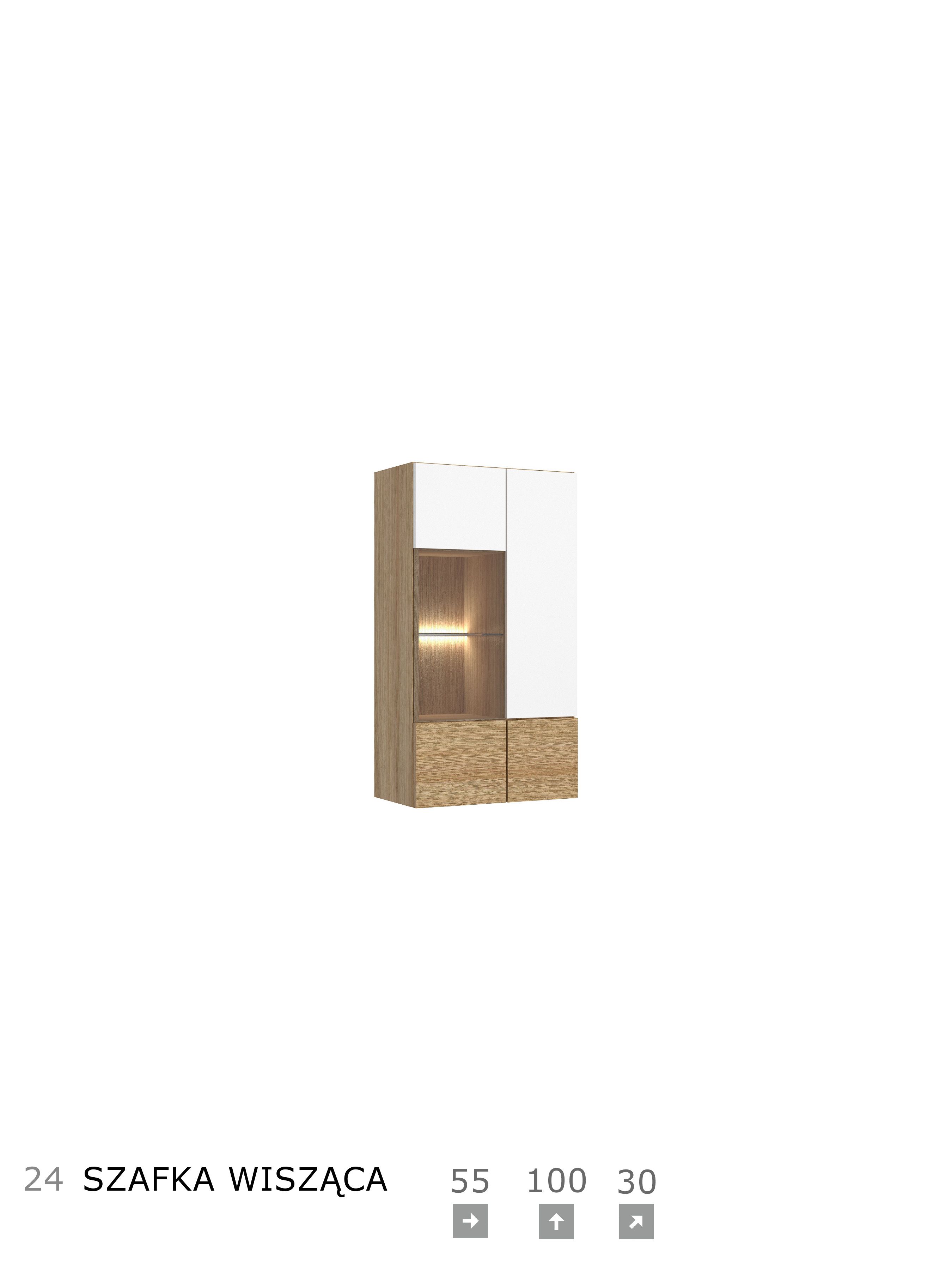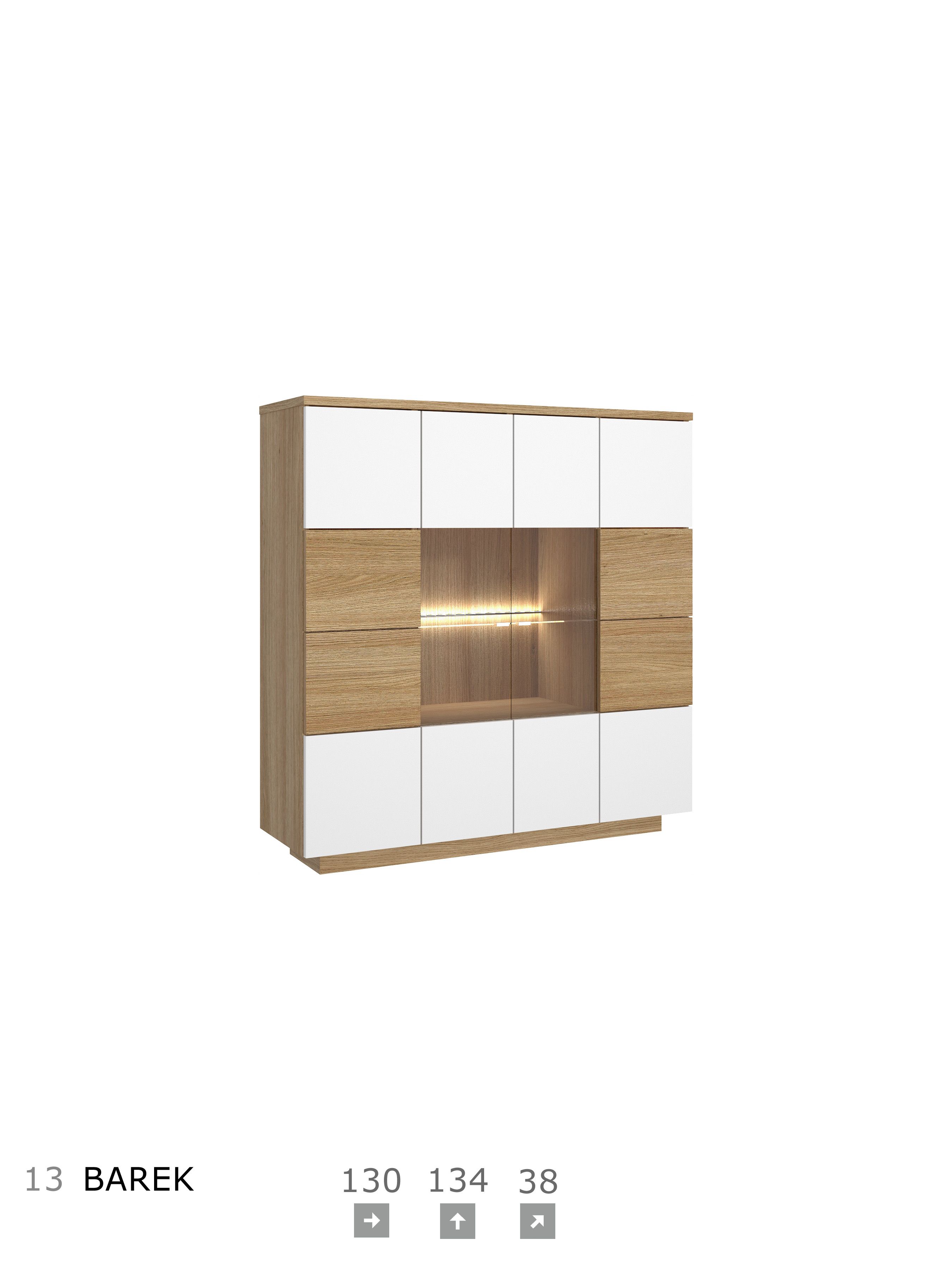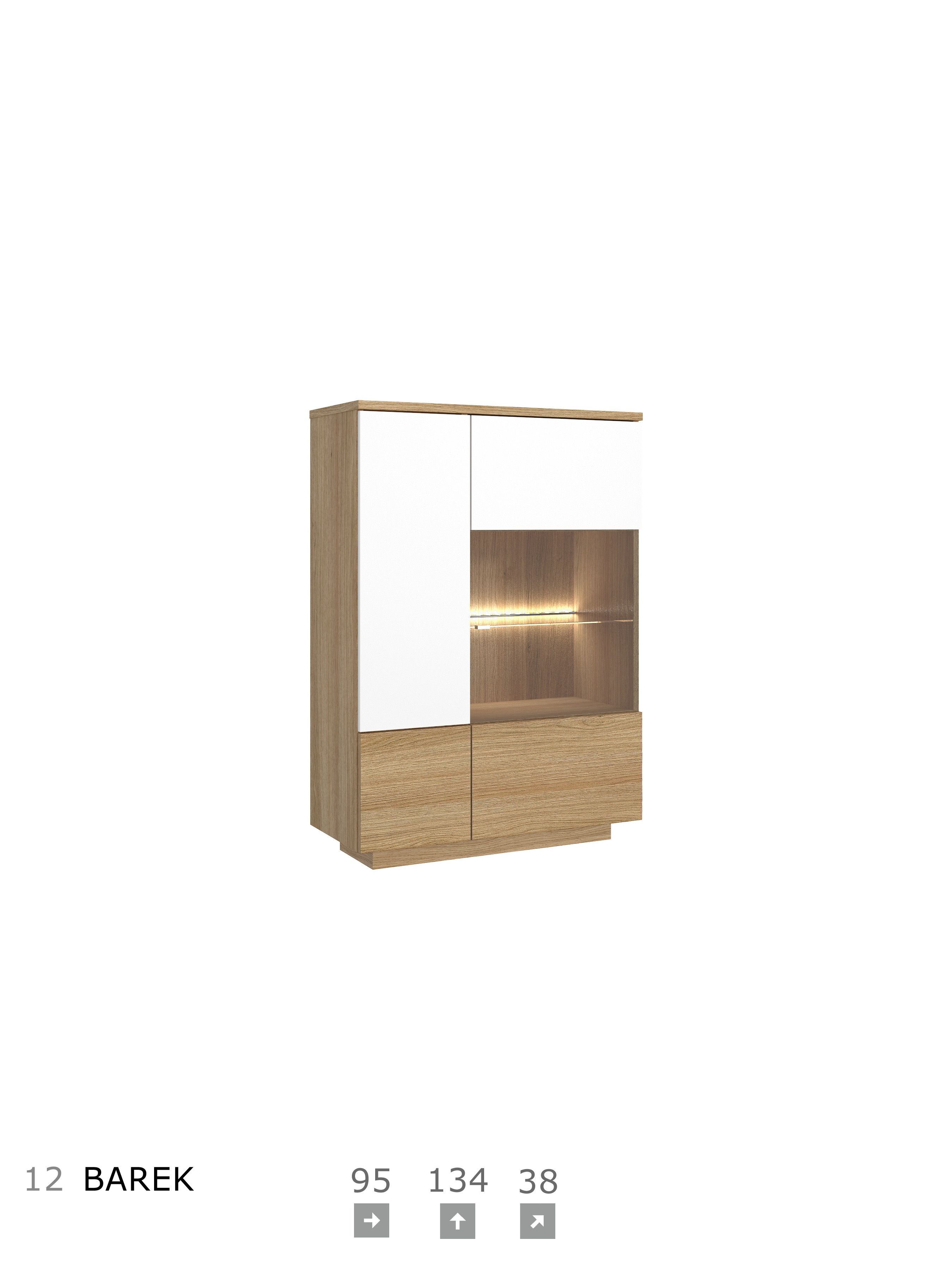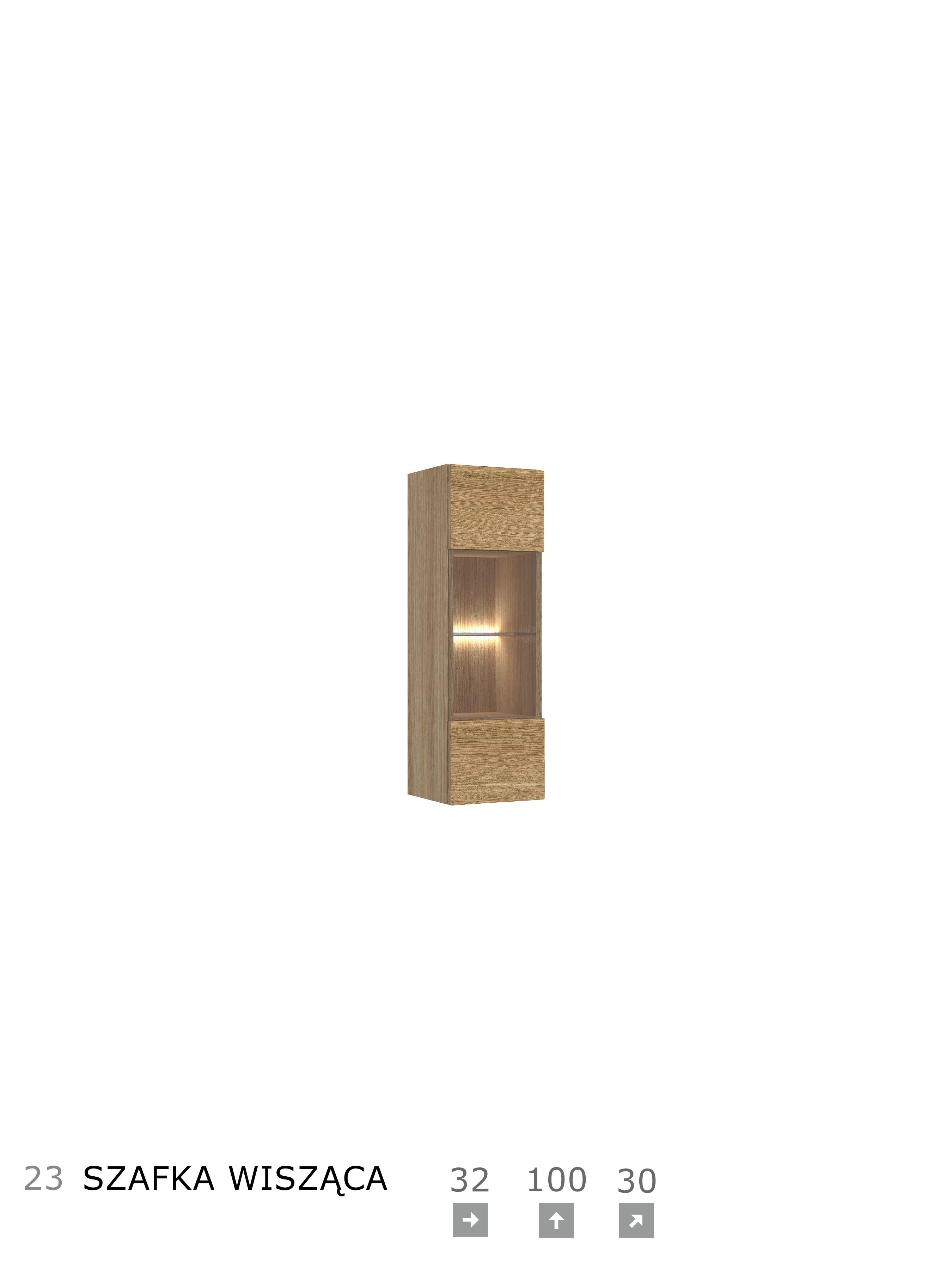 Korpus i blat: okleina naturalna dębowa, płyta meblowa Fronty: okleina naturalna dębowa, płyta meblowa, MDF Szkło: front antisol, półka float System otwierania: push to open, bez uchwytu Witryna i barek: cichodomyk, uchwyt
